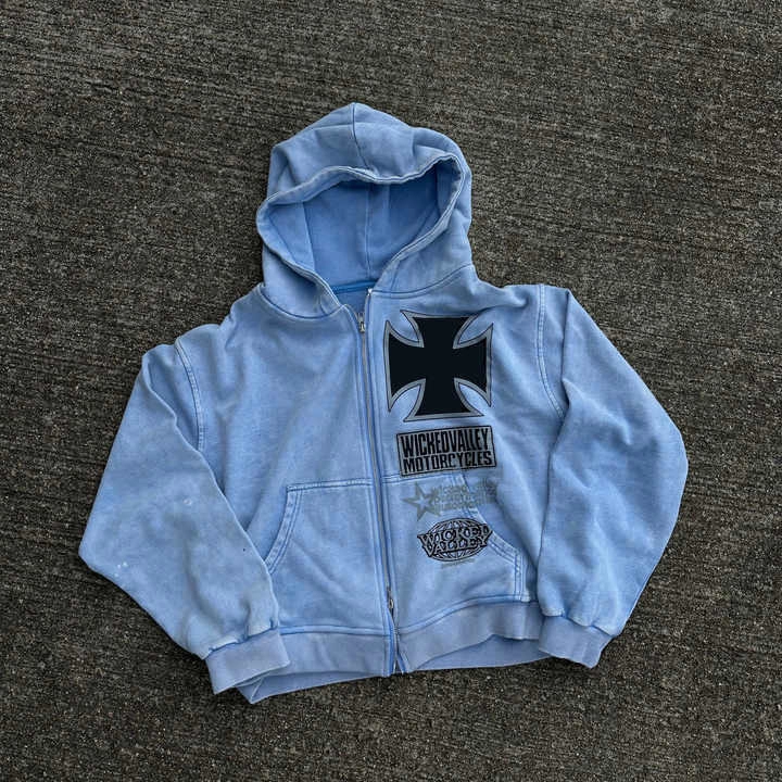 Anti Shrink Acid Wash Cropped Hoodie With Double Zipper Vintage Sun Faded Style
